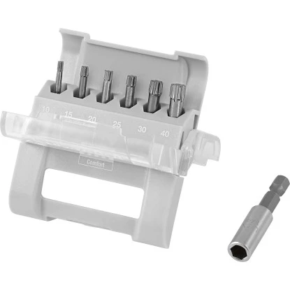 In hochwertiger Qualität aus Stahl hergestellt, eignet sich das 7-teilige LUX-TOOLS Bitbox Set Comfort Torsion-TX für den privaten handwerklichen Bereich. Es zeichnet sich durch seine Langlebigkeit und gute Standzeit aus. Das Set umfasst die gängigen Größen TX10, TX15, TX20, TX25, TX30 und TX40 sowie einen magnetischen Bithalter. Das Antriebsprofil ist sternförmig angelegt, es besteht aus insgesamt 6 Nocken. Die Vorteile liegen darin, dass Sie TX-Schrauben mit einem wesentlich höheren Antrieb eindrehen können, ohne das Profil zu beschädigen. Zudem wird weniger, bis gar kein Anpressdruck bei der Arbeit beispielsweise mit einem Handbohrer oder Akkuschrauber benötigt.
