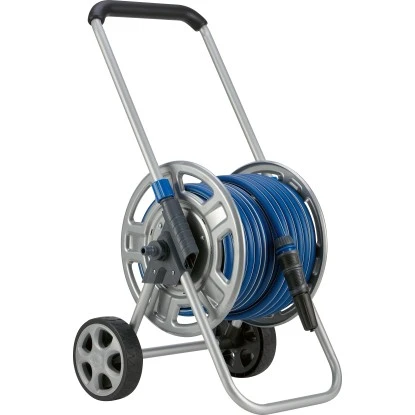 Die Trommel des Schlauchwagens ist im Speichen-Design ausgeführt. Sie besteht aus langlebigem und rostfreiem Metall. Zentral befindet sich die Handkurbel, mit welcher Sie den Schlauch mühelos auf- und abrollen können. Bügel und Rahmengestell bestehen ebenfalls aus solidem Metall. Ergänzt wird die Ausstattung durch ein 6-teiliges Reinigungsspritzen-Set mit variabel einstellbarer Düse, Schlauchschnellverschlüssen des Querschnitts 33,3 mm (G 1) und einem Hahnstück der Größe 26,4 mm (G 3/4). Das Set bietet Ihnen UV- und frostbeständige Eigenschaften. Zum Lieferumfang s. allgemeine Informationen.