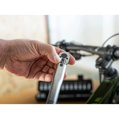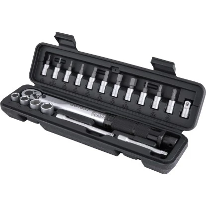Mit dem professionellen Drehmomentschlüssel-Set von LUX-TOOLS haben Sie häufig benötigte Steckschlüssel zur Fahrradmontage übersichtlich zur Hand. Dank der beschrifteten Kunststoffbox können Sie alle Teile inklusive des Knarrenhalters griffbereit unterbringen. Dabei bietet Ihnen der Satz eine zuverlässige Qualität, sodass Sie ihn immer wieder einsetzen können. Ohne Kraftaufwand lösen Sie Schrauben oder Muttern und ziehen diese ebenso einfach fest. Hierzu lässt sich die gewünschte Kraftübertragung in einem Bereich von 4 Nm bis 24 Nm einstellen.